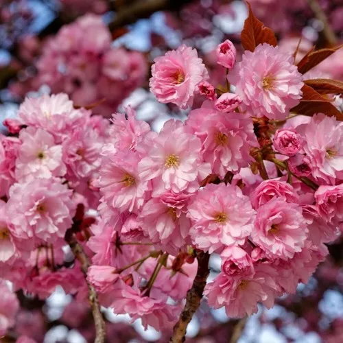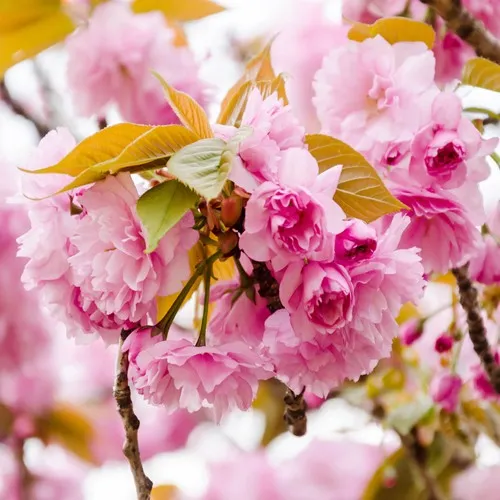 Одной из выдающихся особенностей сакуры Канзан являются её великолепные пурпурно-розовые цветки, которые могут достигать размера до 60 мм. Эти махровые, душистые соцветия, собранные в группы по 2-5 штук, распускаются в начале мая, привнося в ваш сад вдохновляющую атмосферу весны. Множество ароматных цветов создадут облако нежности, привлекая внимание не только садоводов, но и насекомых-опылителей.